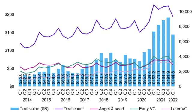 Global VC investment dropped from a high of $191.9 billion across 10,775 deals in Q4’21 to $144.8 billion across 9,349 deals in Q1’22.