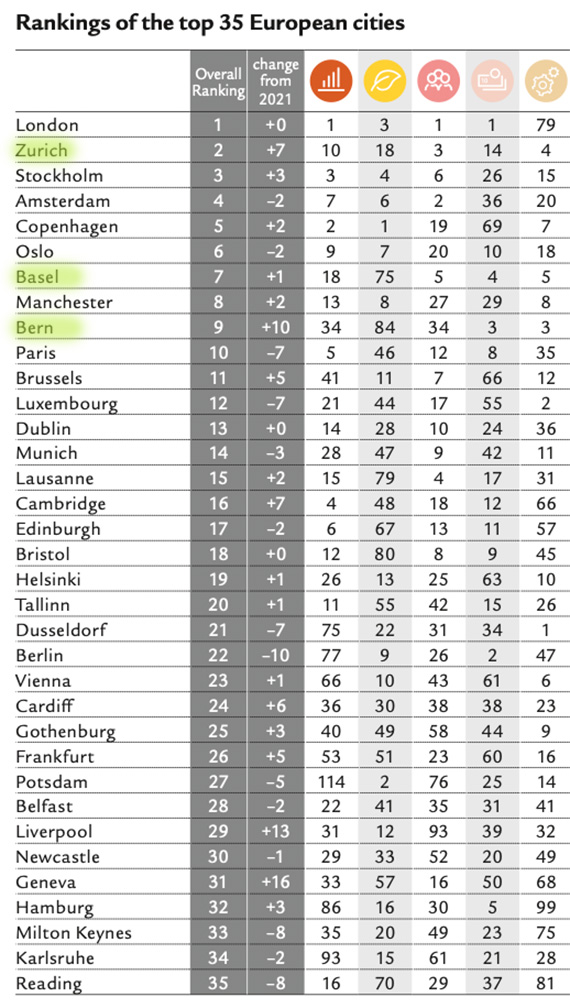 Two other Swiss cities made the top 10 overall, with Basel moving up one spot to 7th overall and the capital Bern joining in 9th, up 10 spots from 2021.
